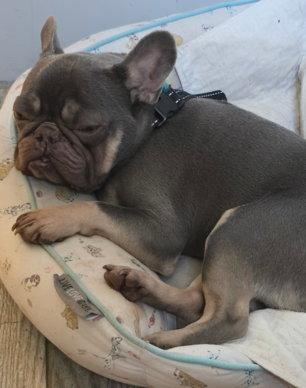 Bilbo is a playful and active Frenchie boy! You can often find him hanging out on his dog bed with a good nylabone chew or deer antler, snuggling with his people or, in true Frenchie fashion, searching for a soft place to take a nap (as long as it’s near his people). Bilbo does well when walking on a leash and gazes ahead making sure no uncertainties lie ahead. He can get uneasy/anxious and very nervous when in an unfamiliar situations and will seek reassurance and guidance from his leader. Bilbo looks to his human for comfort (and correction, if needed) when his insecurities get the best of him.